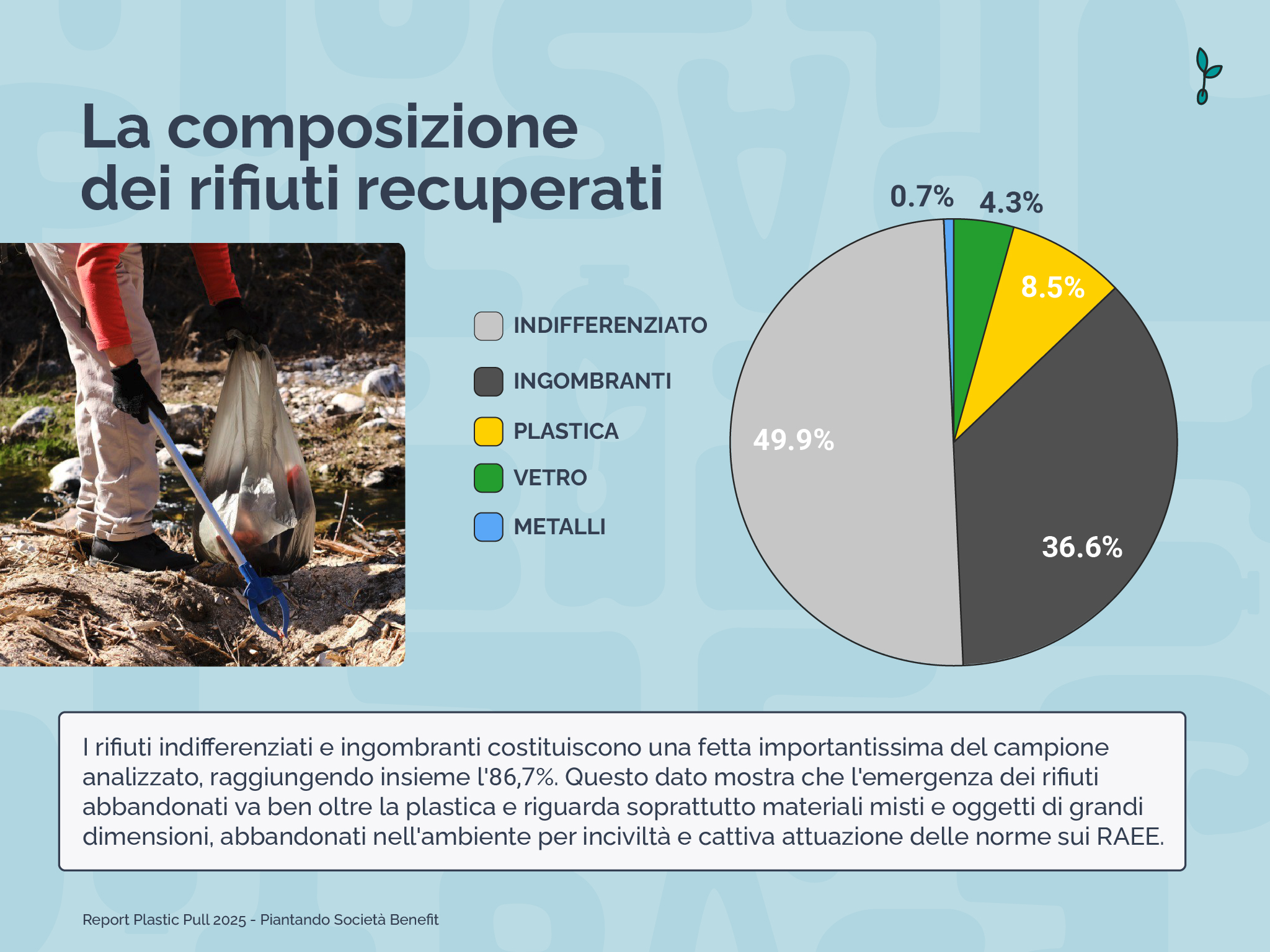 Il Report Plastic Pull 2025 di Piantando, frutto di una ricerca durata 3 anni che ha portato alla rimozione di oltre 257.000 kg di rifiuti abbandonati nell’ambiente. Città, fiumi, spiagge e parchi, non c’è stato ecosistema dal quale Piantando e le sue associazioni non abbiano recuperato rifiuti abbandonati. I dati parlano chiaro: la concentrazione di rifiuti si trova prevalentemente nei centri abitati, superando la somma delle aree costiere e verdi, contro ogni previsione.