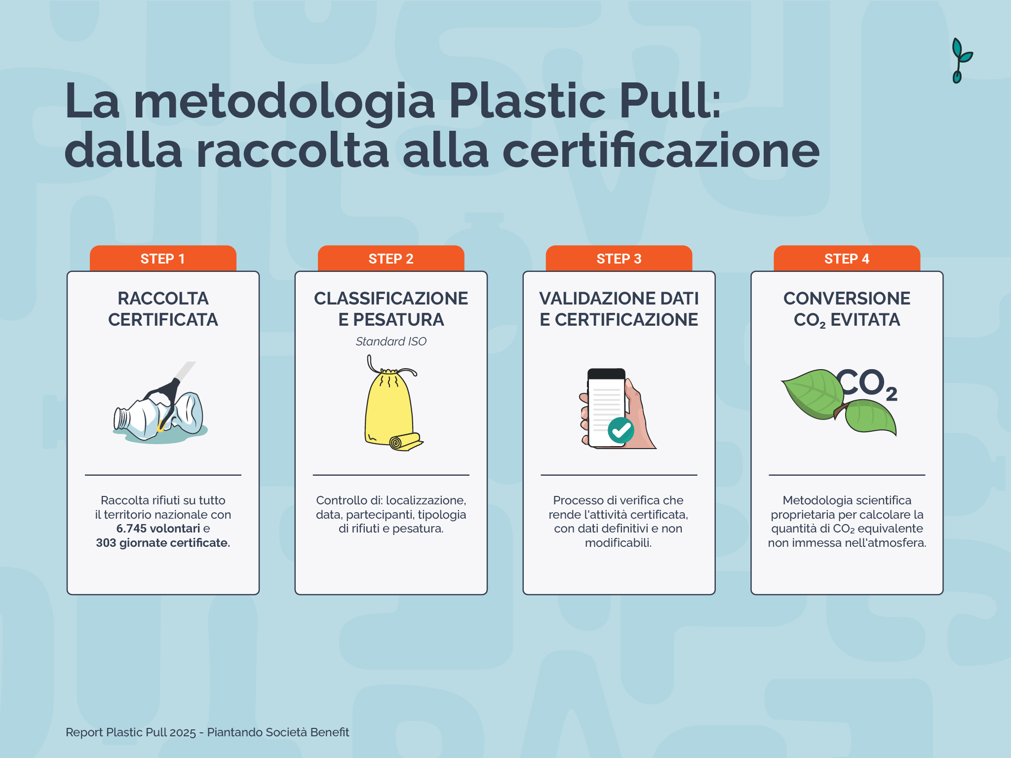 Plastic Pull utilizza una metodologia scientifica proprietaria per calcolare l'esatta quantità di CO₂ equivalente non immessa nell'atmosfera grazie a quella specifica raccolta. In pratica, vengono convertiti i chilogrammi di rifiuti recuperati e riciclati in un'azione climatica concreta e quantificabile, fornendo un risultato tangibile e autorevole.